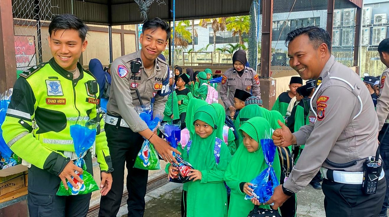 Selain mengenalkan profesi polisi, para personel juga memberikan edukasi sederhana tentang pentingnya tertib berlalu lintas, seperti penggunaan helm, menyeberang jalan dengan aman, dan tidak bermain di jalan raya.